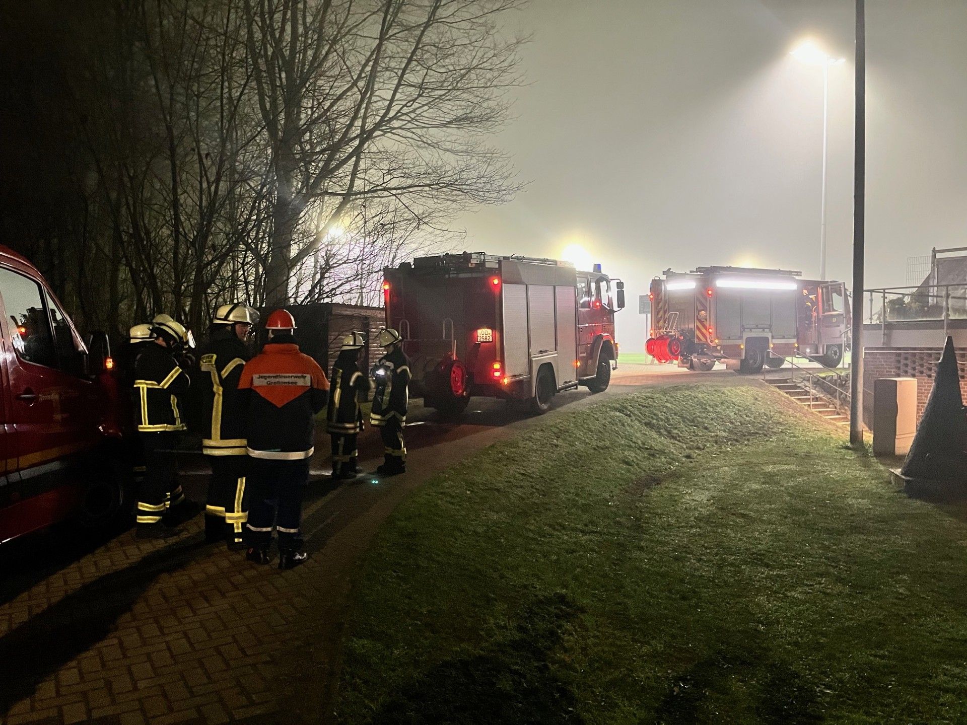 Nach Rücksprache mit der hinzugezogenen Rufbereitschaft Umwelt des Kreises Stormarn und dem Gewässeraufsichtsamt wurde von uns in den betroffenen Bereich sauerstoffreiches Wasser aus dem in der Nähe befindlichen Lütjensee gepumpt. Parallel räumten wir den Bachlauf mit Hilfe von Wathosen, Sägen und Dunghaken soweit von Laub und Geäst, so dass die Fließgeschwindigkeit wieder zunahm und die eingeschlossenen Fische über einen notdürftig geschaffenen Durchstich in den Lütjensee abwandern konnten. Insgesamt waren wir bei dieser für uns eher ungewöhnlichen Rettungsaktion mehr als 6 Stunden im Einsatz.